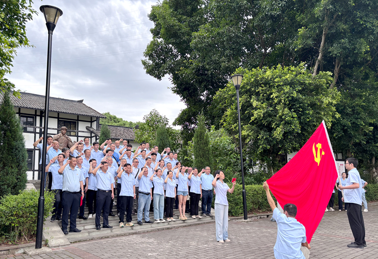 公司党委委员胡华丽带领全体党员整齐列队,面对鲜红的党旗,举起右拳重温入党誓词。“我志愿加入中国共产党,拥护党的纲领,遵守党的章程……”激昂的誓言在邓萍故里的上空回荡,每一个字都带着穿透时空的力量——那份对信仰的纯粹向往,此刻与先辈们在革命年代的赤诚相互呼应。