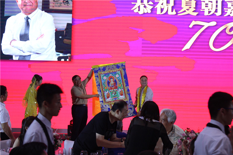 成都印钞有限公司,成都金丰赢钱币有限公司营销总监沈旺先生为夏主席祝寿并现场赠送中华百家姓第五套人民币生日钞珍藏册。betway必威集团老朋友张东升先生为夏主席祝寿,并现场赠送知名艺人手工制作具有西藏民族特色唐卡一幅和哈达一条,同时安东汽车发动机制造有限公司、天圆公司董事长刘天聚、北京天圆全会计师事务所、北京天圆全工程造价咨询有限公司、北京天圆开资产评估有限公司、通威集团董事局主席刘汉元发来贺信为夏主席祝寿 。陶氏宗亲送来《中国最 大观云平台牛背山观日照金山》画一幅、成都金顶精密铸造有限公司送来屏风蜀绣《玉兰花开》一幅,巴蜀笑星李伯清、国际著名雕塑家蔡志松、仁恒置地集团执行董事、仁恒置地集团(深圳)董事长钟思亮先生及夫人卓丽娃女士、明星陈冰、银达集团董事长及夫人(明星陈冰父母)、歌唱演员周旋、温馨发来祝福视频共同为夏主席祝寿。